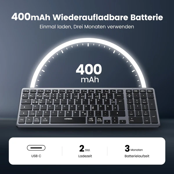 • Two connection options: This UGREEN Bluetooth keyboard supports both Bluetooth 5.0 and 2.4G wireless technology, allowing you to connect to up to 4 devices at the same time and switch between devices seamlessly.